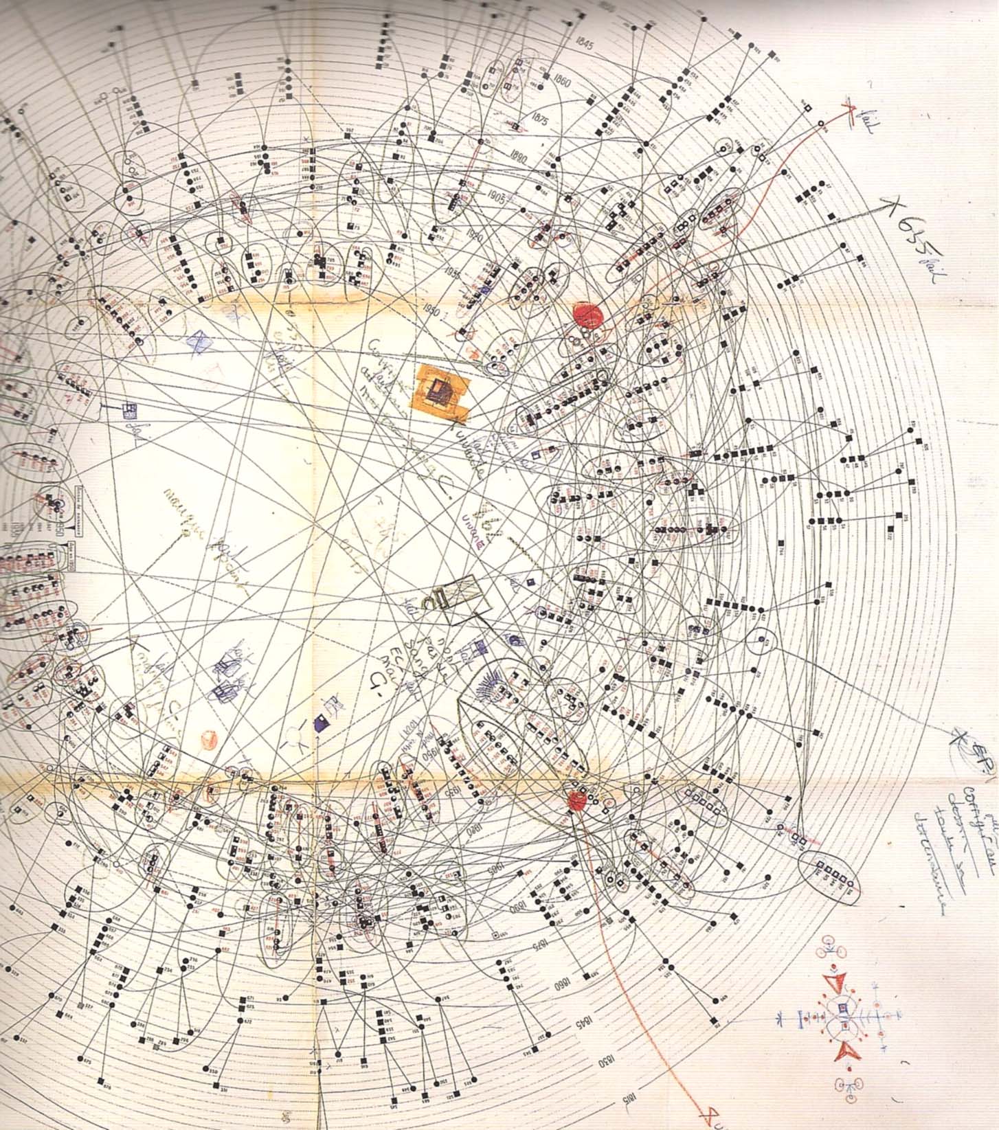 Currently working on a research project related to Canadian and Greenland Inuit with R0gMedia in Berlin. The diagram above is a genealogical diagram made in the mid 1950s by anthropologist Jean Malaurie, the first of its kind. It’s a hand made radial drawing, Malaurie has a whole series of them in his apartment in Paris, along with his extensive personal archive of research materials including photos, films, notebooks, drawings. While the broader aims of the project are to find an institution willing to host the collection, I’m trying to make an digital artefact out of this diagram that could bring the information alive and demonstrate how historical anthropological materials can be made relevant and contextualised for present and future generations. DIS2012 published a paper on this project for a workshop about slow technology. Slow technology DIS2012
