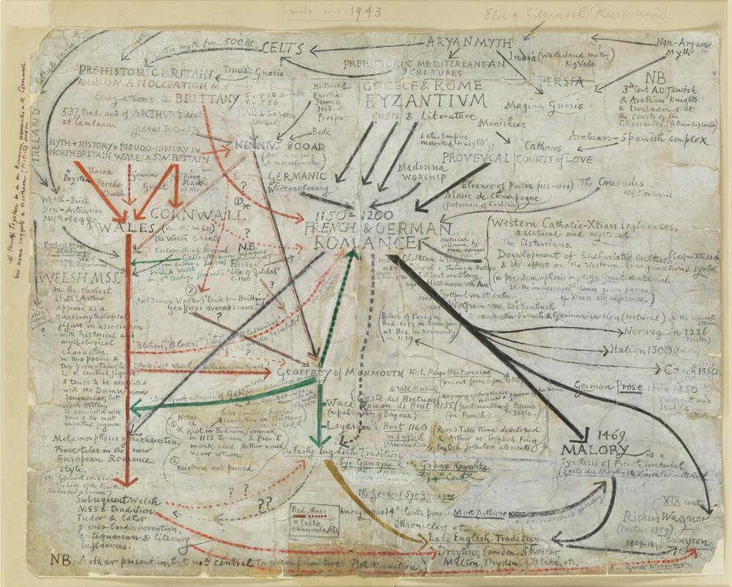 “Chart of sources for Arthurian legends” – Graphite text with ink on paper – David Jones (1949)