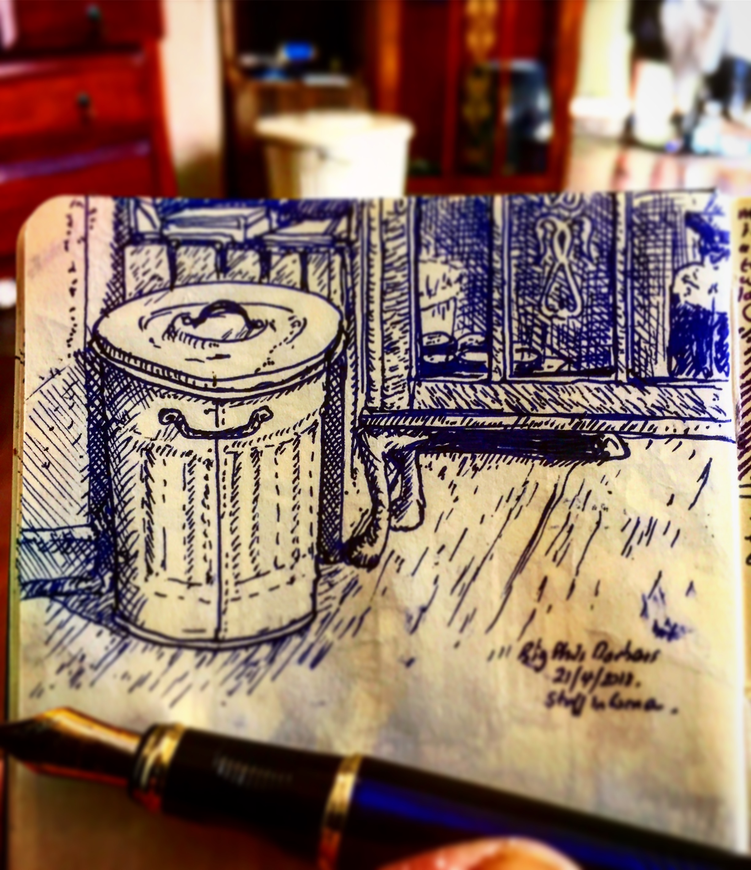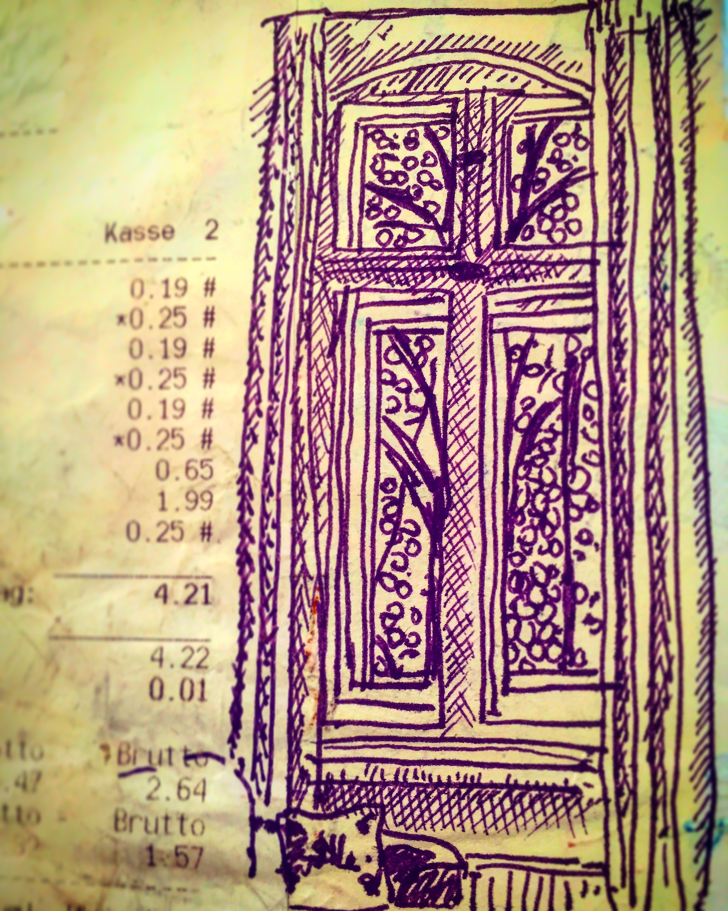 Another lost drawing from last Springβs trio to Berlin. This is the window of the flat we stayed in in Wilmersdorf with a portion of the receipt from the grocery shop over the road.