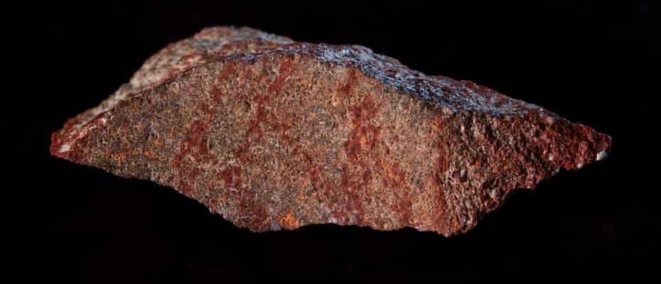“The simple red marks adorn a flake the size of two thumbnails which appears to have broken off a grindstone cobble used to turn lumps of ochre into paint powder. The lines end so abruptly at the fragment’s edges that researchers believe the cross-hatches were originally part of a larger design drawn on the cobble.