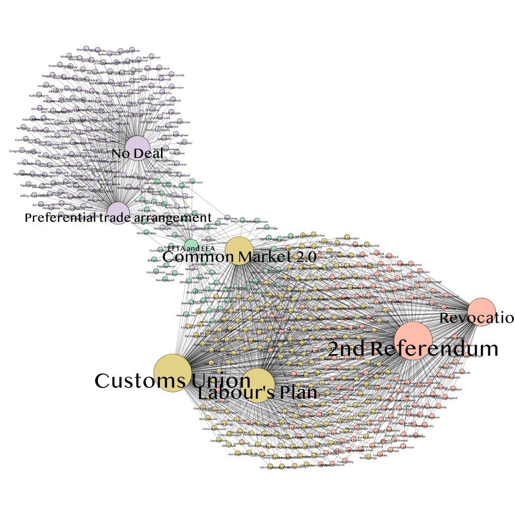 In the graph above (zoomable version here), I have mapped the votes of British MPs in the 8 options given to them on March 27 (a couple of hours ago) in indicative votes. This is a 2-mode network linking MPs and options for Brexit. The network graph shows how different options are related to each other: they are closer if a greater number of MPs have voted for them. Their size shows the number of favourable votes for each option (none of them obtained a majority. The graph show the high level of polarisation over these different options, with two clear poles: the “Hard Brexit” pole with a number of MPs for whom the only option is No Deal, or a preferential trade arrangement, and the Soft Brexit-No Brexit pole, linking the Customs Union, Labour’s Plan and a Second Referendum/Revocation of article 50. The EFTA/EEA and Common Market 2.0…