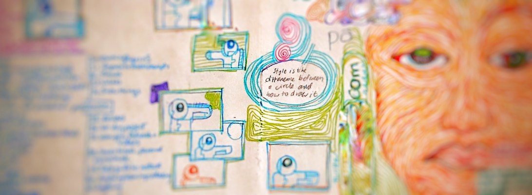 This is before I started using the first page spread as an index for the rest of the book. So the lists here are largely inspirational items and ideas of content capture. There’s not much order and I tend to fill empty spaces with bits of ephemera stuck in and doodles.
