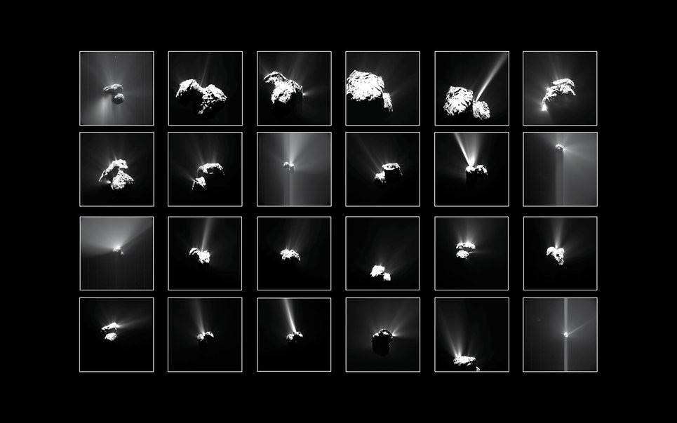 “A compilation of the brightest outbursts seen at Comet 67P/Churyumov-Gerasimenko by Rosetta’s Osiris (Optical, Spectroscopic, and Infrared Remote Imaging System ) narrow-angle camera and navigation camera between July and September 2015. After nearly two years apart, Europe’s Rosetta spacecraft will join its stranded robot probe Philae on 30 September on the icy surface of the comet.”