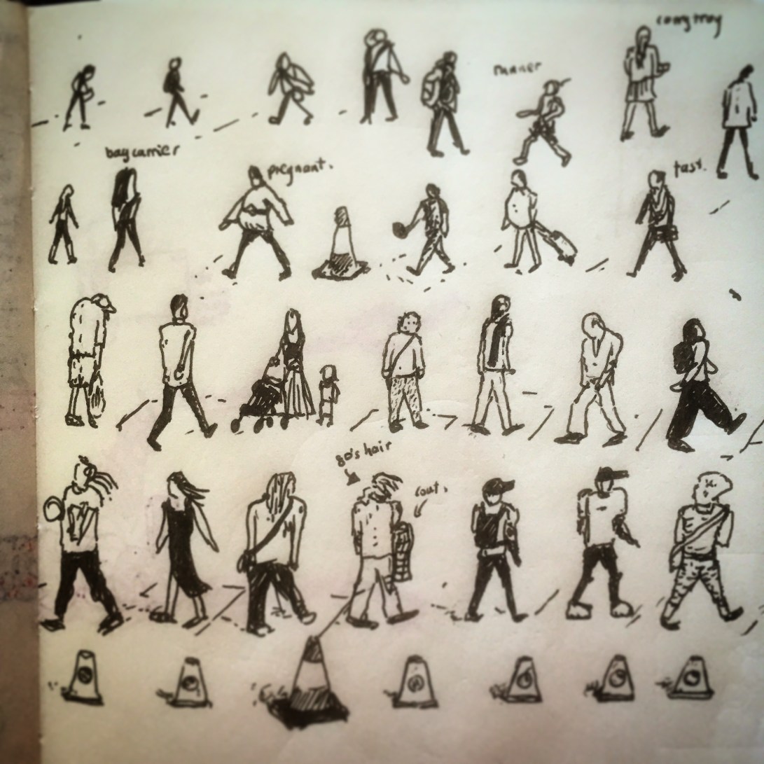 90/365 White ladies Road walkers walking. Long day doing very slow test render frames, heavy ray tracing. Took to drawing people going by outside. There are two trees framing my vantage point, so I had 2 to 4 seconds (depending on pedestrian velocity) to see the individual, then made the marks after they had disappeared from view. Reminds me of a life drawing exercise where model and easel are placed in separate rooms, sometimes separate floors to promote the act of looking. Bonus traffic cones. V-ball. Notebook: Ethel