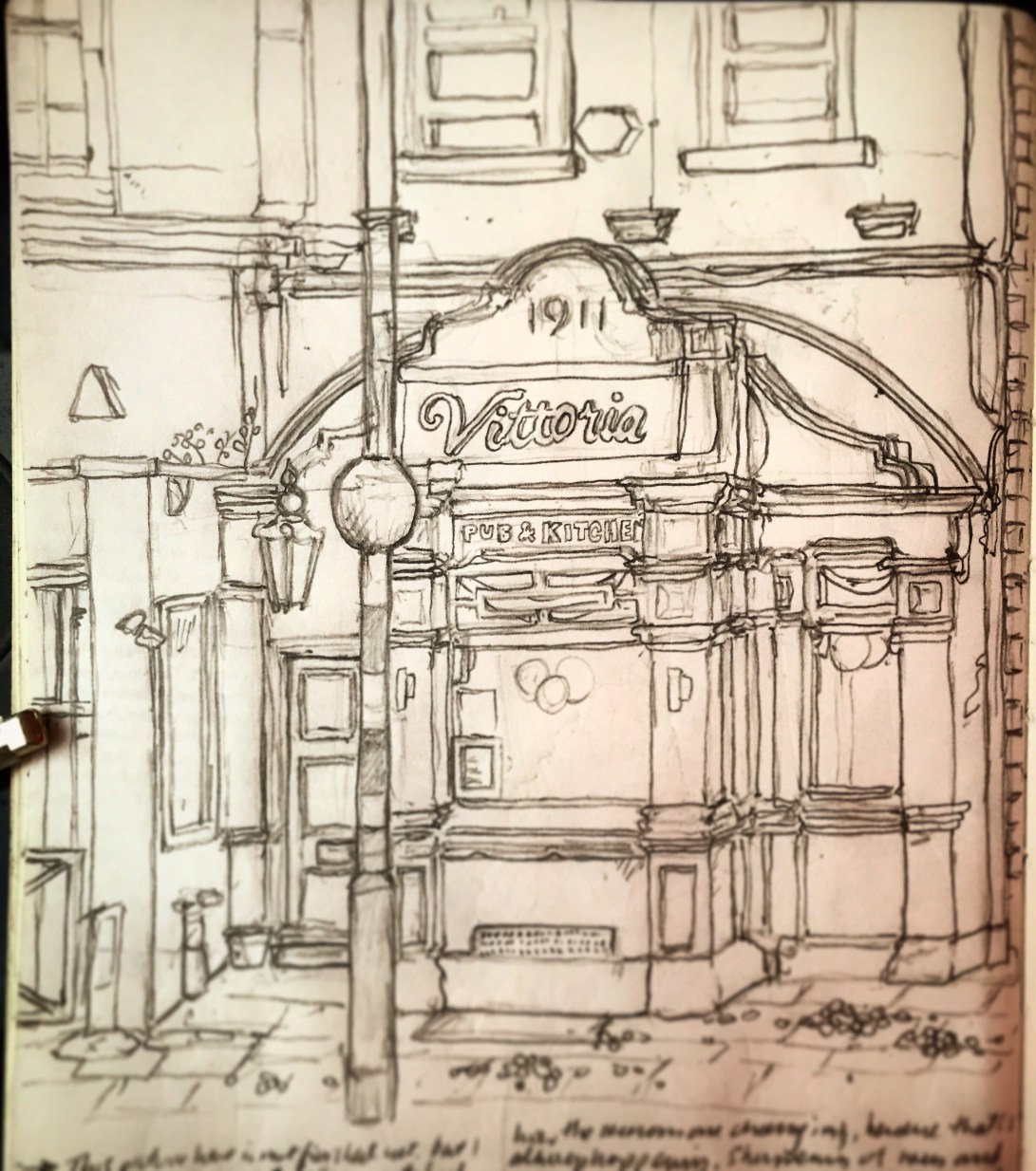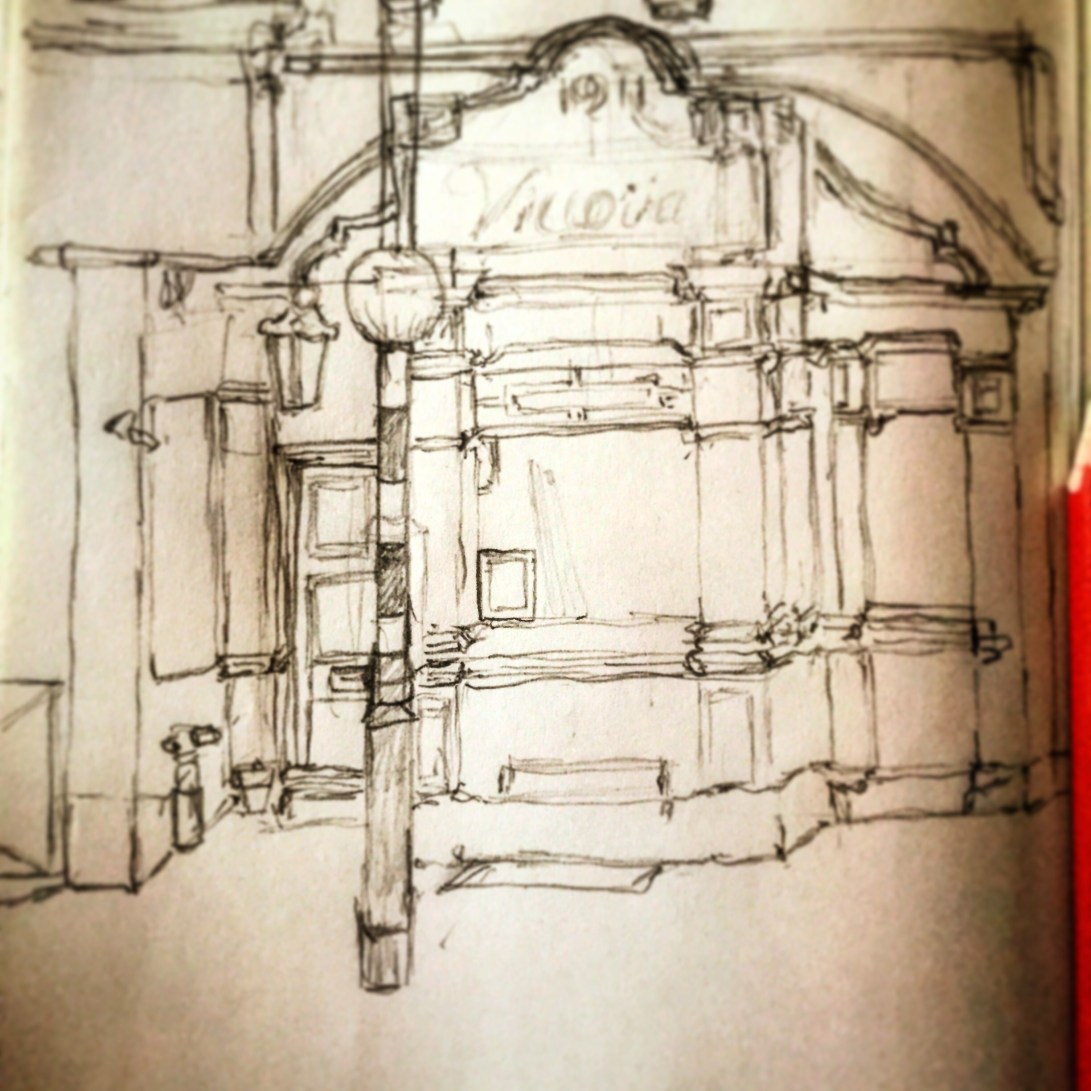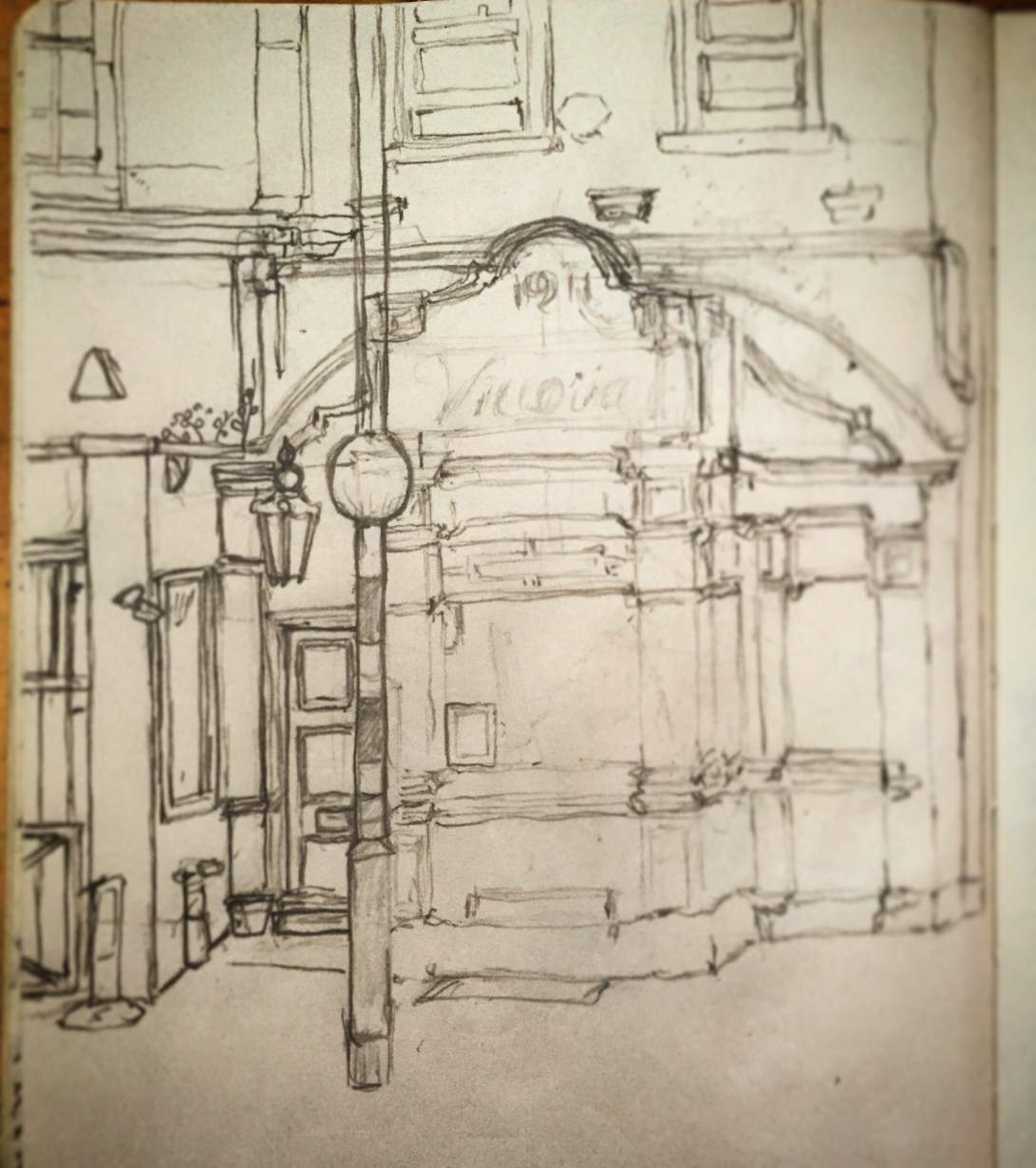112/365 Half full glass on patterned table cloth. Multi-coloured Stabilo. 16 mins Notebook: Ethel.113/365 Dismaland doodling. Quite good there, it is. Very lucky to get tickets, thanks S. Anniversary treat. A reminder of life before parenthood. Uniball. Notebook: Artemis.114/365 Another lunch break pass at the architectural complexity that is the Vittoria. One more go after this and I think it might be done. Pencil Notebook: Ethel115/365 Saplings in Leigh Woods, drawn on the move whilst discussing the merits of time travel in narrative forms. It was agreed Days of Future Past was a bad example, I cited Philip K Dick’s The Skull as a good one. 5 mins (with distraction) Black Stabilo Notebook: Artemis.