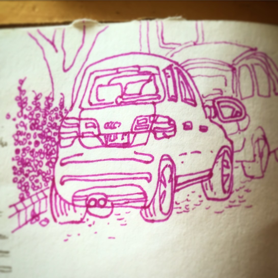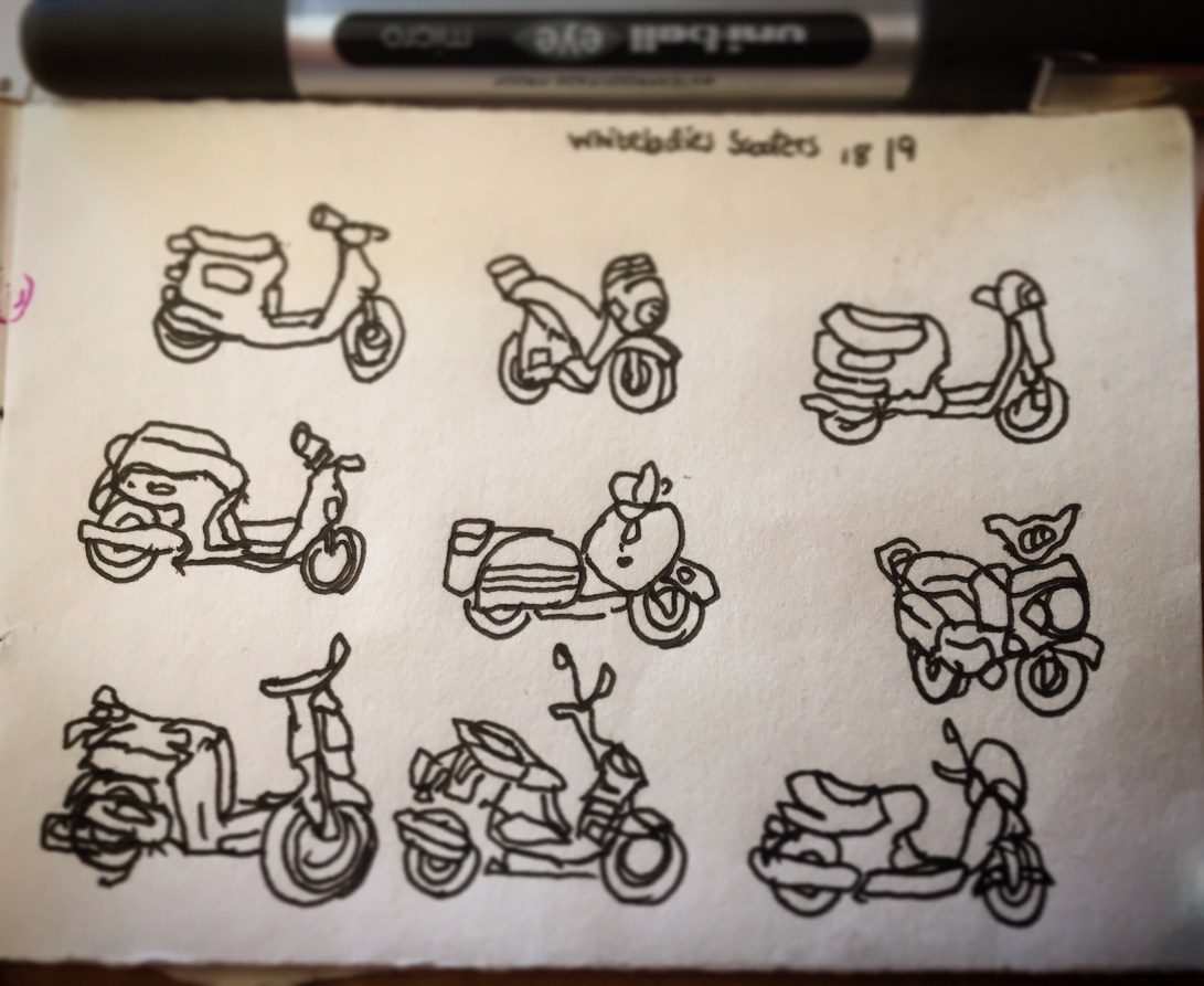 102/365 Lunchtime car drawing. 10 mins Stabilo point 88. Notebook: Artemis.103/365 Fixing mechanism on the Draper Telescopic Trestle that supports my standing desk. Drawn whilst waiting for a thing. Uni ball micro. 7 mins. Notebook: Ethel.104/365 View from window at work. It’s taken some time this one. This is probably the fifth update? I thought I’d get the leaves done before they fell off again. Drawn whilst waiting for large framed Arnold test renders. Time: unknown. Pencil. Notebook: Ethel.105/365 Japanese anemones. Catching these before they keel over too. DRAW ALL THE FLORA ASAP. Coloured Stabilo point 88. 20 mins. Notebook: Ethel106/365 More work on the sketch of the beloved Vittoria begun on 91/365. Still warm enough to sit outside so. Pencil. 15 mins. Notebook: Ethel.107/365 Various species of scooter from outside Whiteladies Scooter shop. Some of them might be the same scooter, some of them may be the amalgamation of two. Lovely day though. 10 mins Straight to Uni-ball Eye Micro. Notebook: Artemis (homemade)108/365 Tea break drawing of the Gardena THS 400 which I recently have been wielding up ladders, trimming the hedges,bushes, trees and other rampant plant life as one does in the Autumn. 7 mins Straight to Uniball Micro. Notebook: Ethel.109/365 View across to the Ring o’Bells and the Holy Trinity from the Grove. Another bonus summer weekend, a walk in the park, football, jumpers for goalposts etc etc. Time for the bears to start hibernating soon, no? Two colour Stabilo point 88. 15 mins. Notebook: Ethel110/365 Desk fan. Dealing will the heat generated by the all heavy heavy brain activity. 15 mins Multicoloured Stabilo. Notebook: Ethel111/365 Shoes, trainers and boots of various kinds. Season changes, footware changes. Ka-ChingπΆ!!! You know how it goes. Straight to Uniball Micro. 15 minutes. Notebook: Ethel